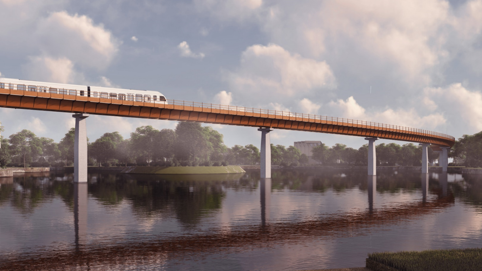Key milestone for elevated mass transit system at HS2's Interchange station: Artist's impression of the HS2 APM crossing Pendigo Lake