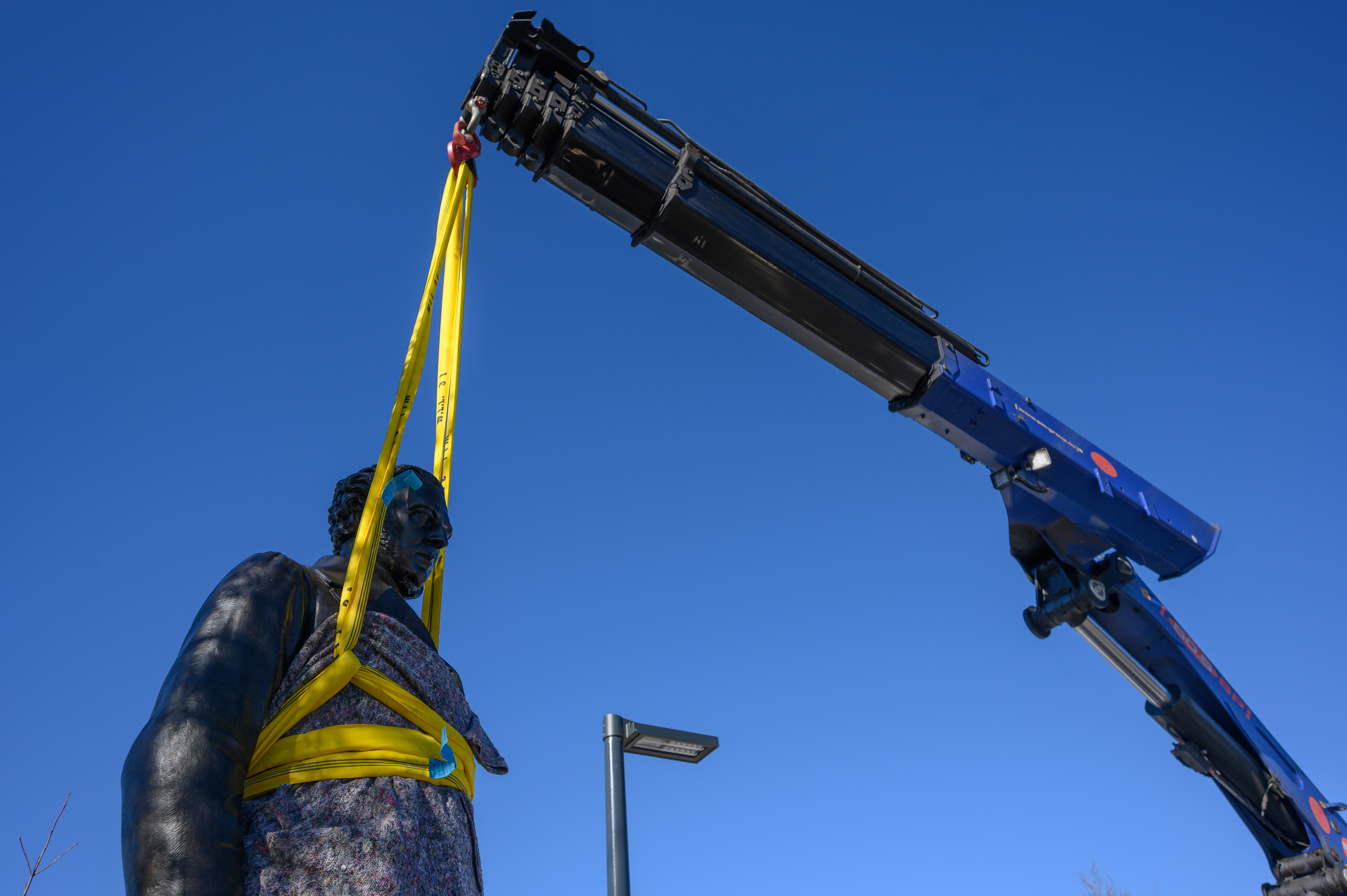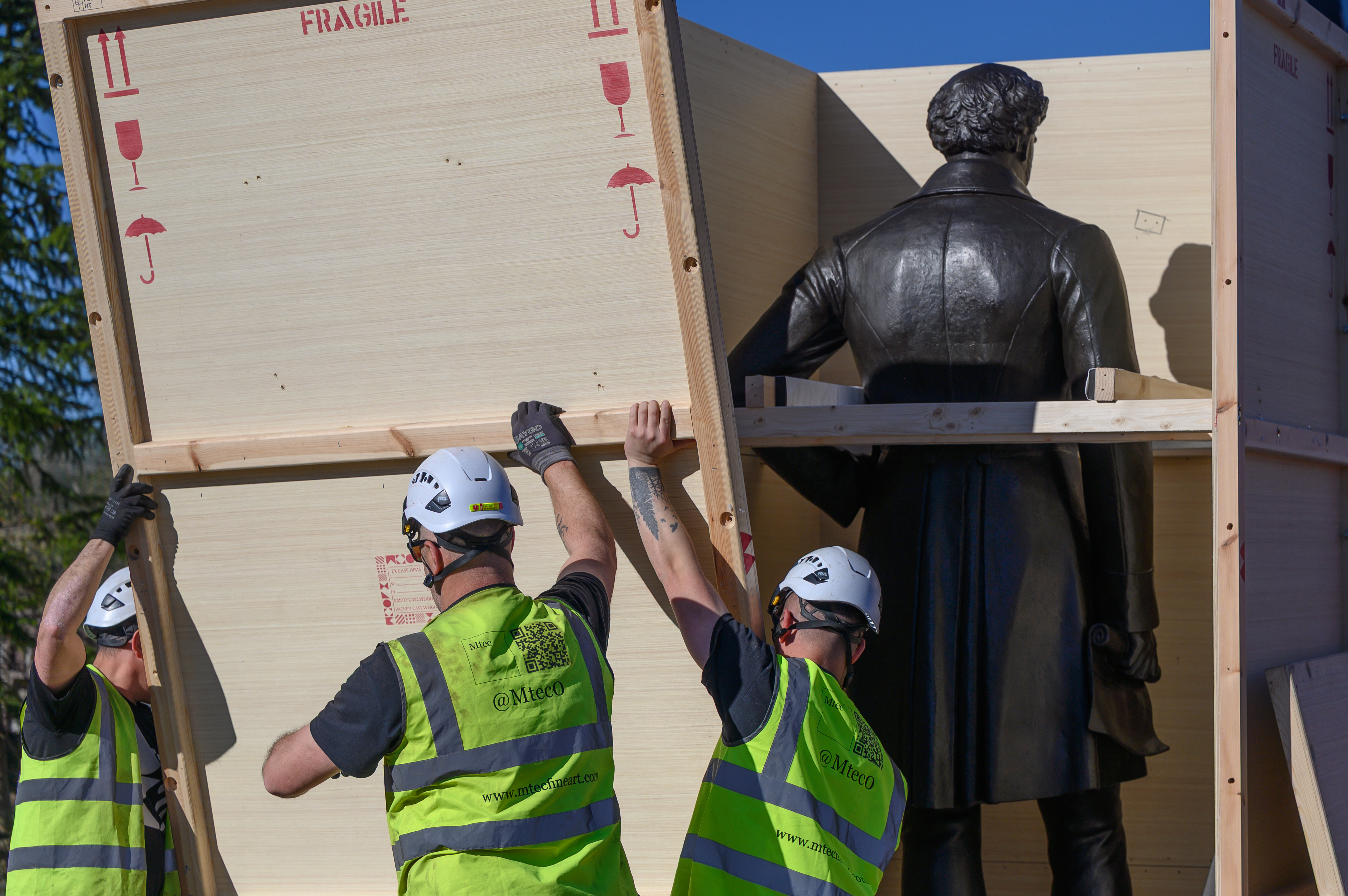 After some conservation work and cleaning, the statue – which is roughly twice life-size – has been lifted and fixed into place outside the museum. It goes on official display on Wednesday 9th April.