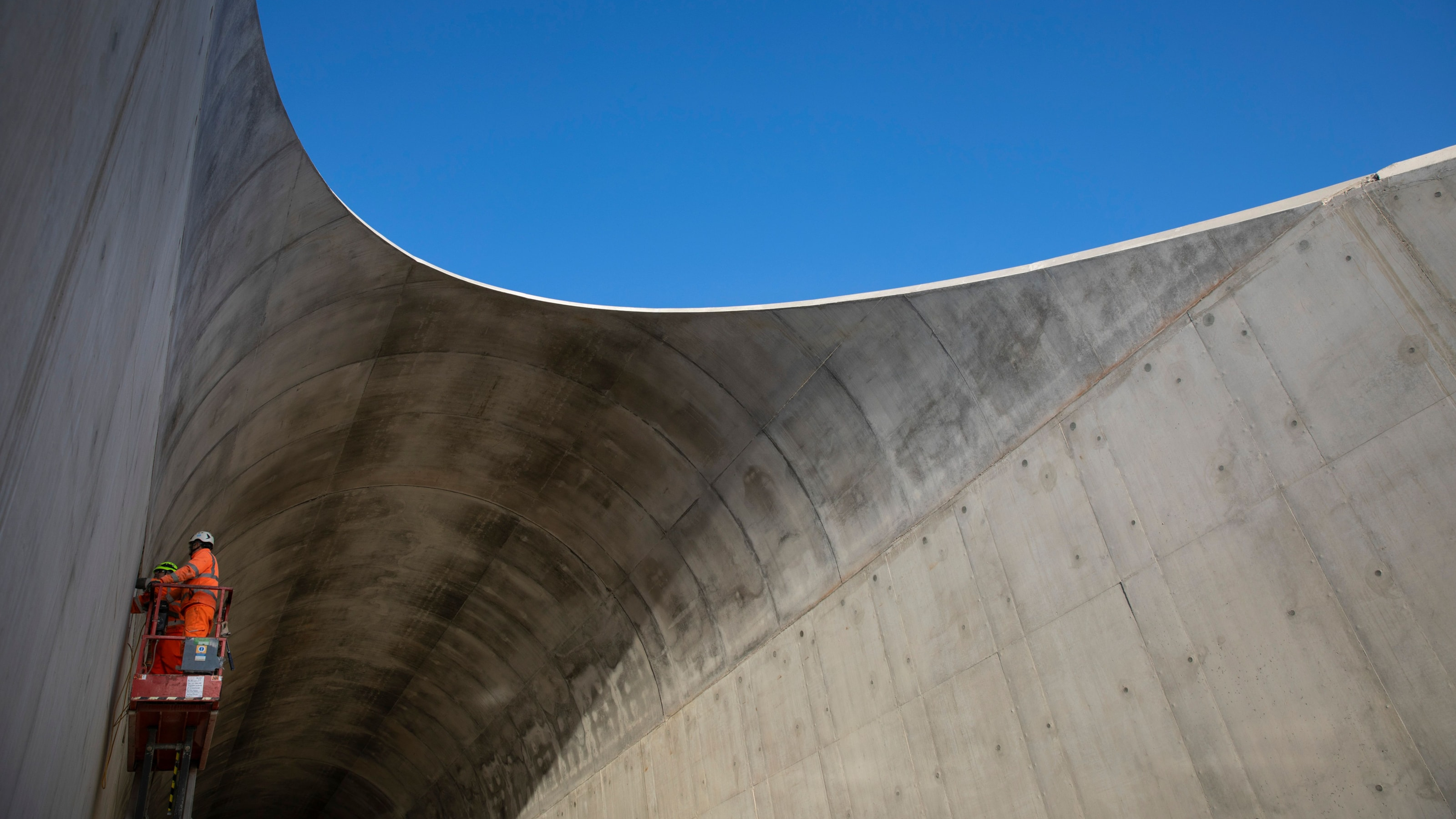 To mitigate against ‘sonic boom’ HS2’s tunnel beneath the Chiltern Hills requires bespoke portal extensions. Protruding up to 220 metres – around the length of two full-size football pitches – from a chalky cutting near the M25 motorway, they are each punctuated along one side with ventilation portholes. These enable some air pushed forward by the train to escape, making the pressure increase more gradual so that the micro-pressure wave emitted from the other end of the tunnel is undetectable.