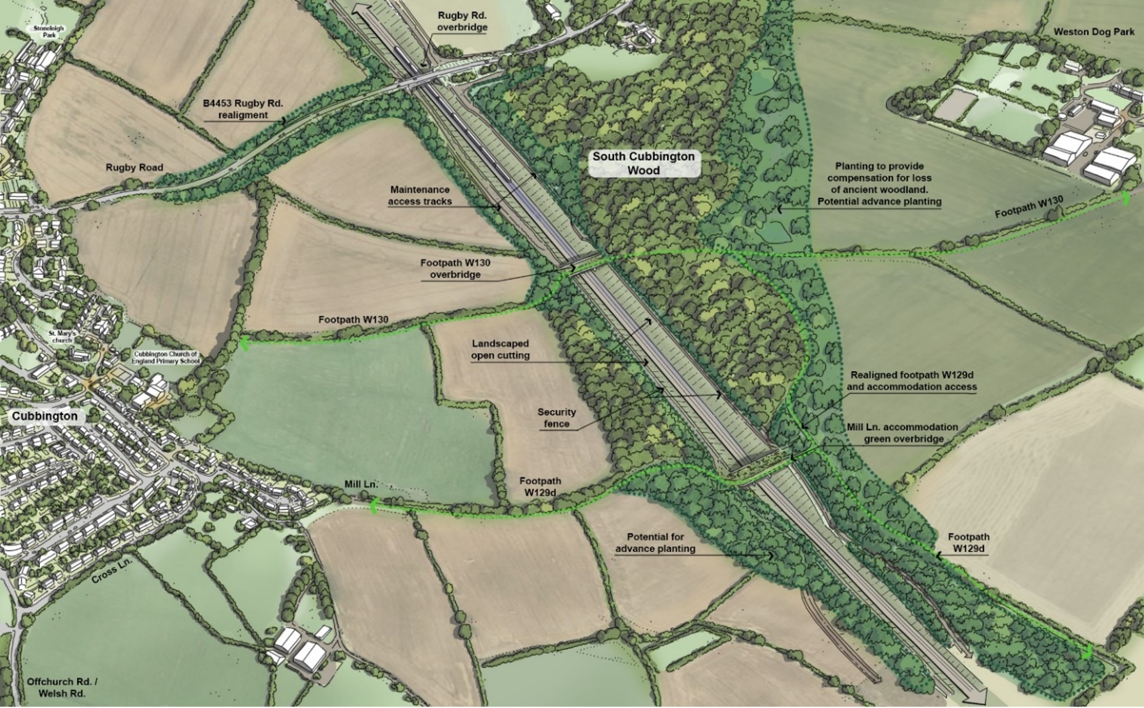 “The introduction of grass seeded cutting slopes in this locality, paired with the construction of two ‘green’ overbridges, will provide increased crossing opportunities for local wildlife and preserve pre-existing footpath connectivity to the Cubbington woodland for local communities.”