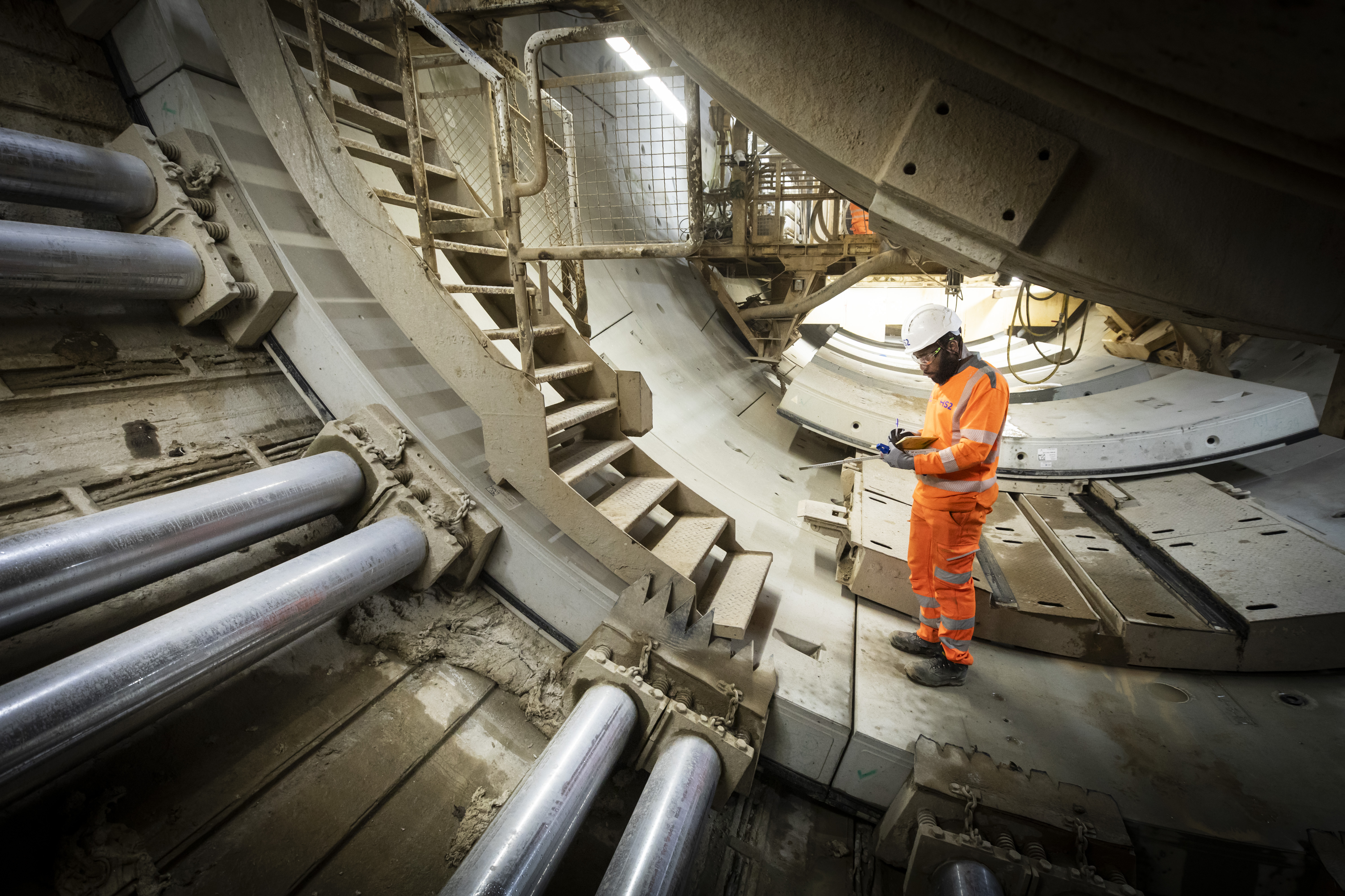 TBM Caroline completes 5 mile journey- TBM miner checking the tunnel ring segment installation