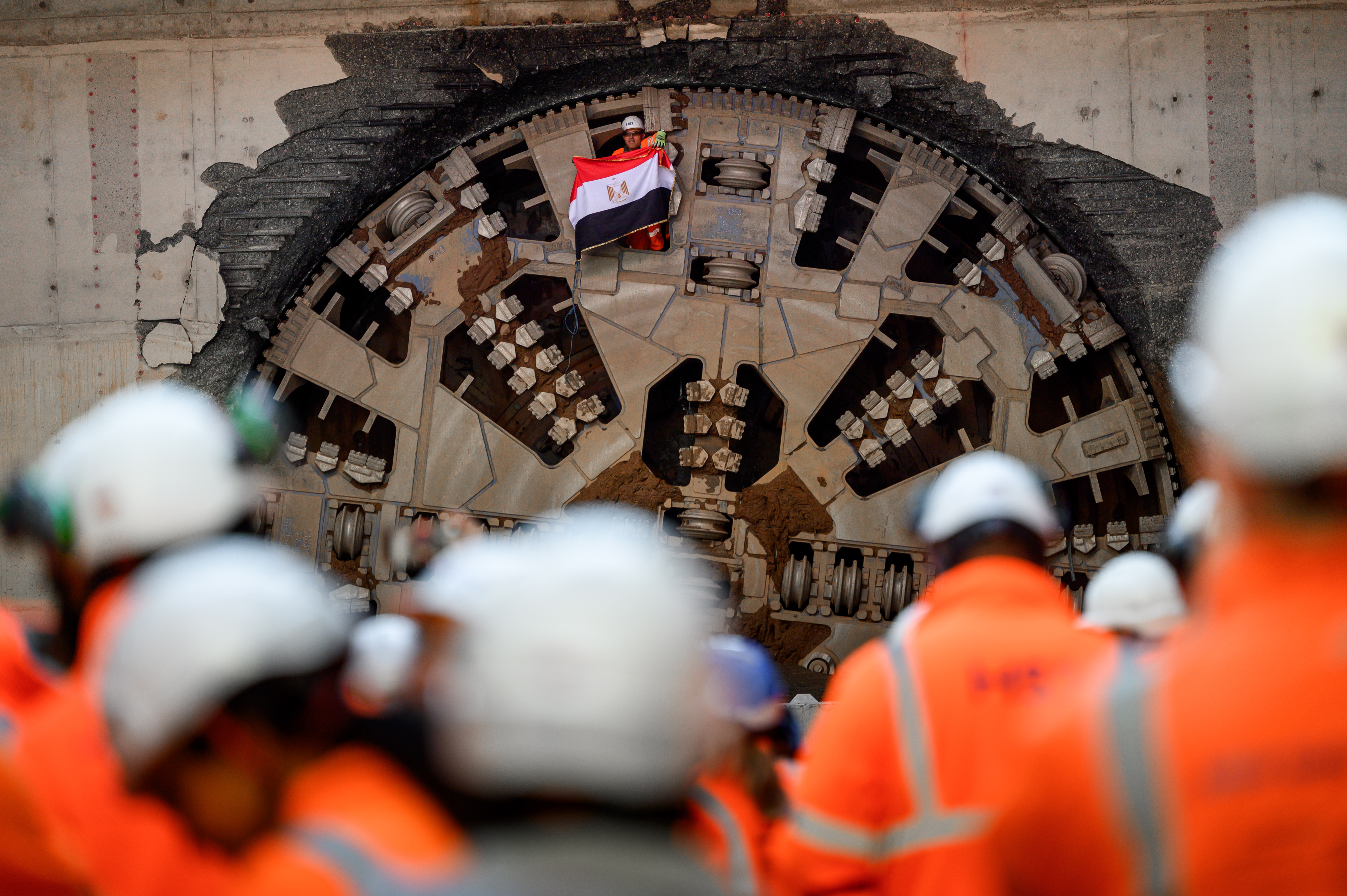 HS2 tunnelling miner holds flag of Eygpt through giant cutterhead of TBM Mary Ann after completing the breakthrough in Bimringham