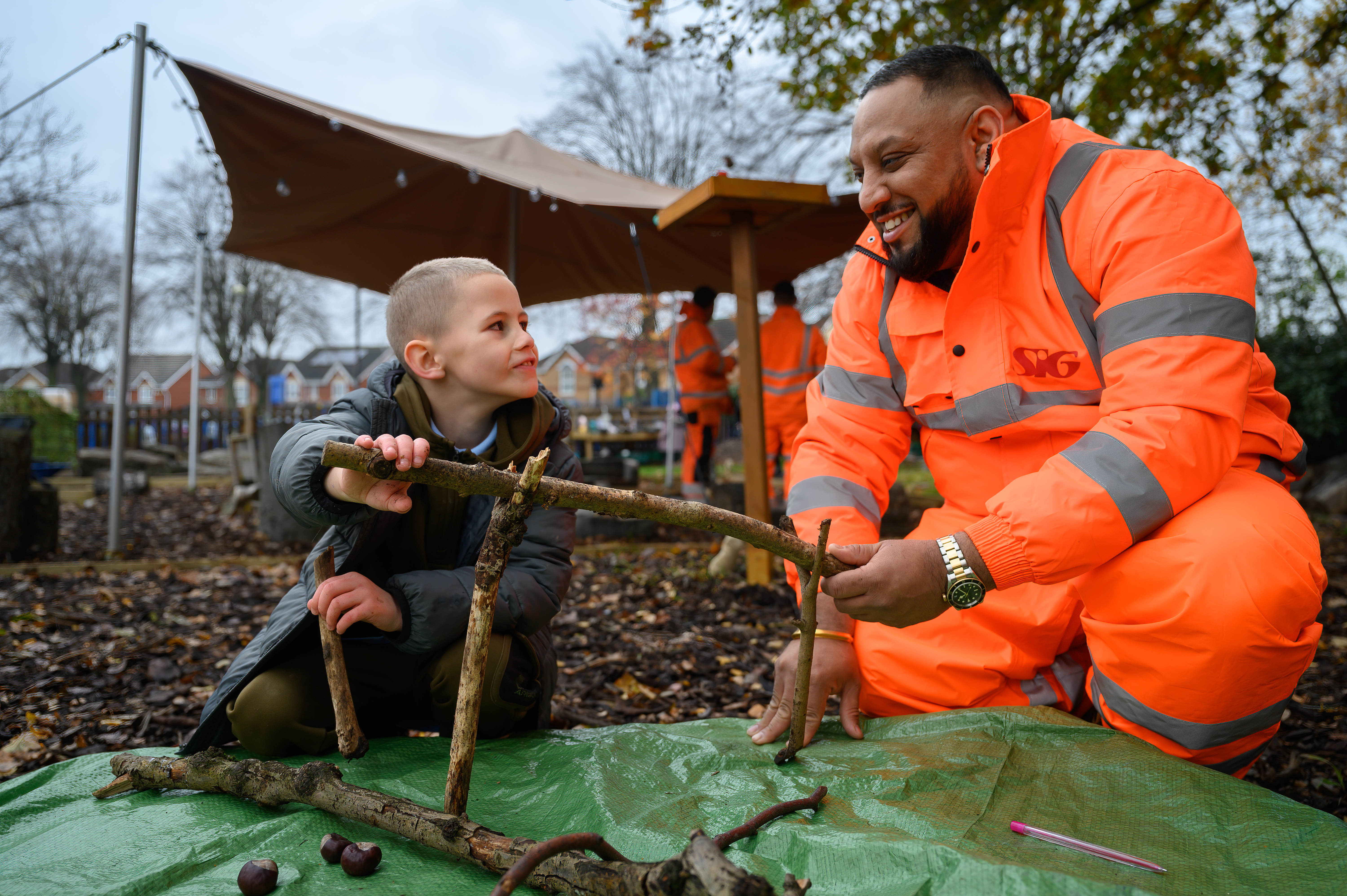 A pupil and SIG volunteer in the new Forest School at Paget Primary School