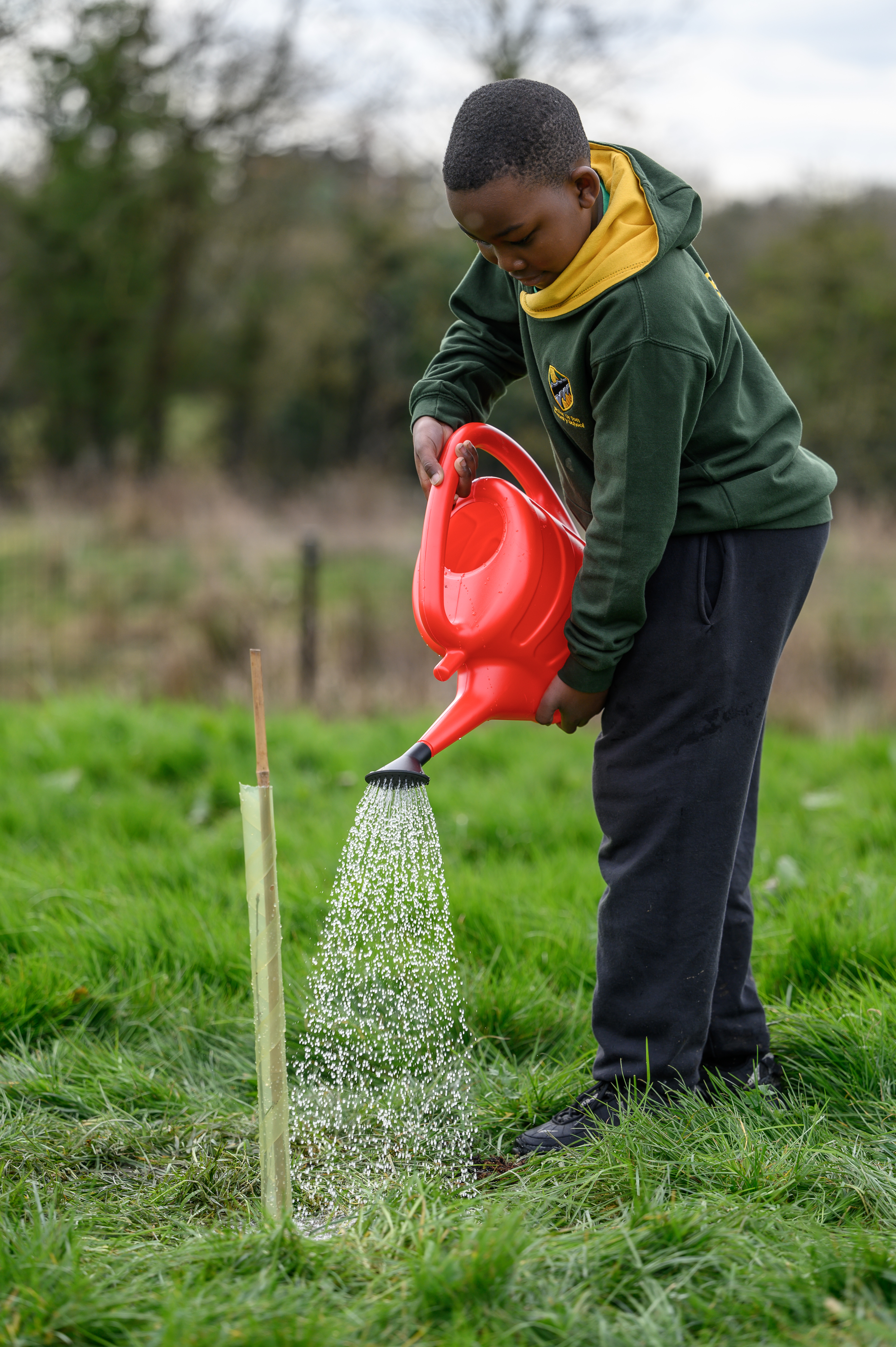 A Water Orton Primary School pupil watering in a new oak sapling donated by HS2, March 2022