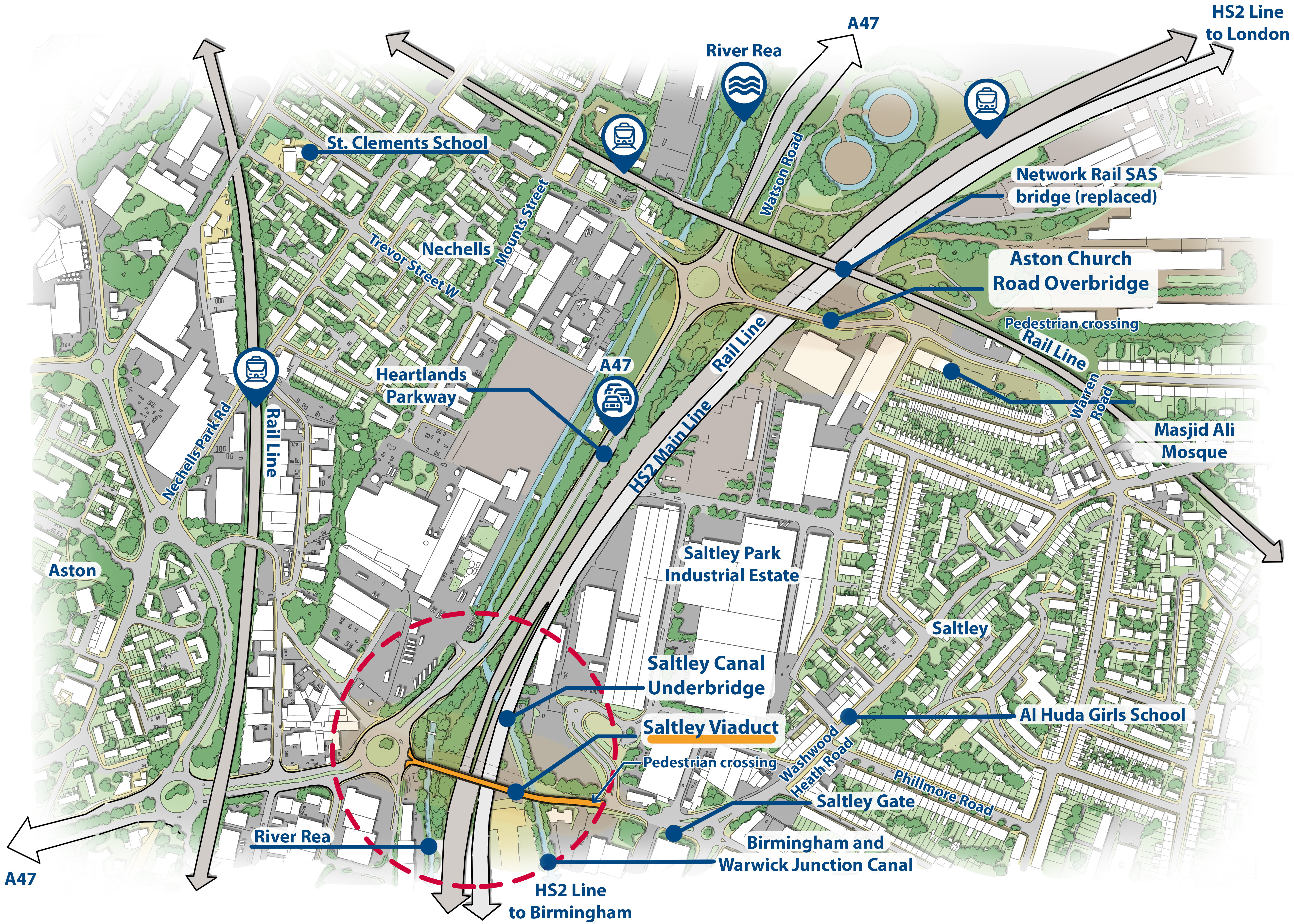 Saltley Viaduct and Aston Church Road Overbridge aerial sketch
