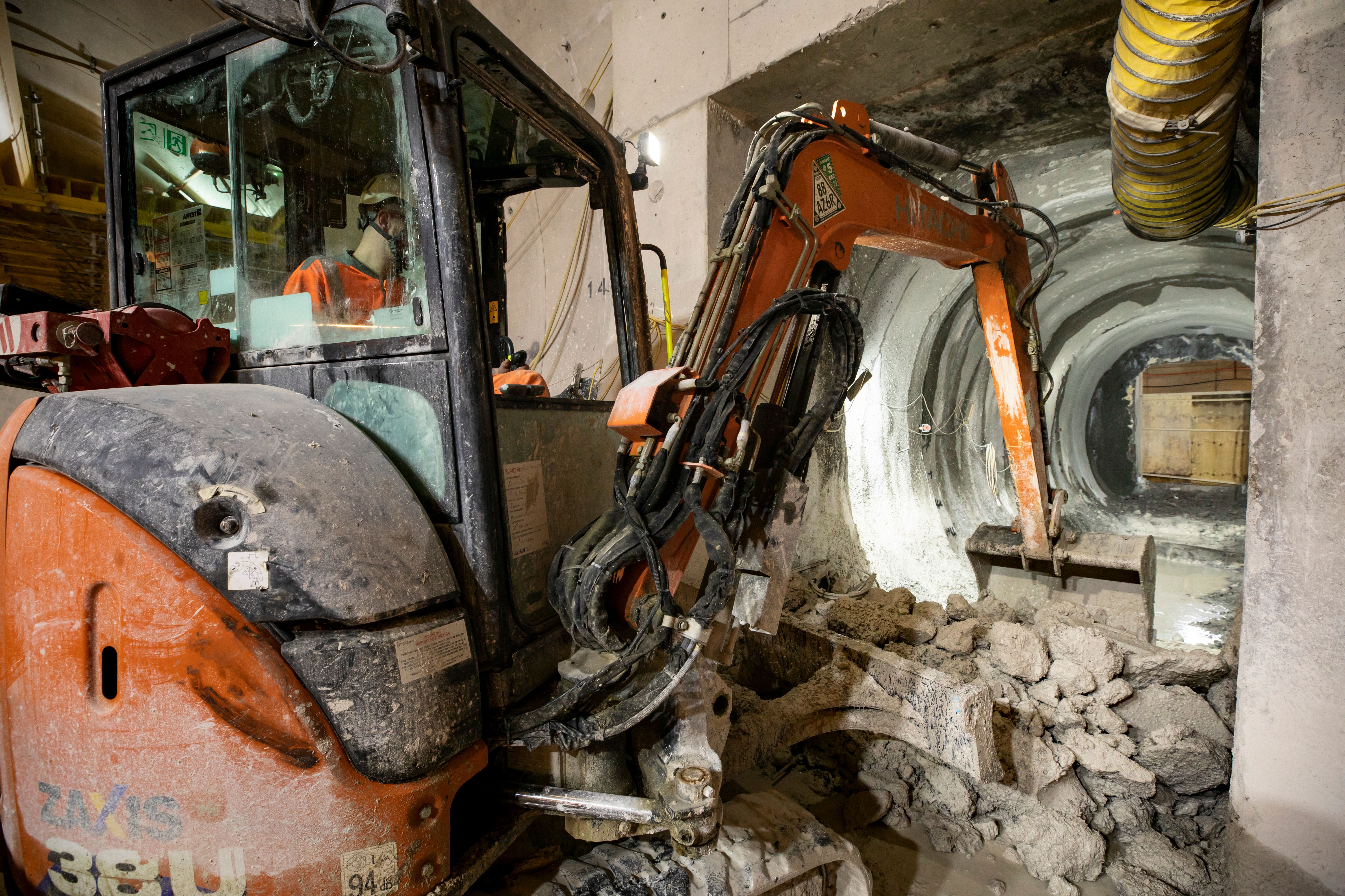 Excavator at work during the construction of a cross passage for the chiltern tunnel
