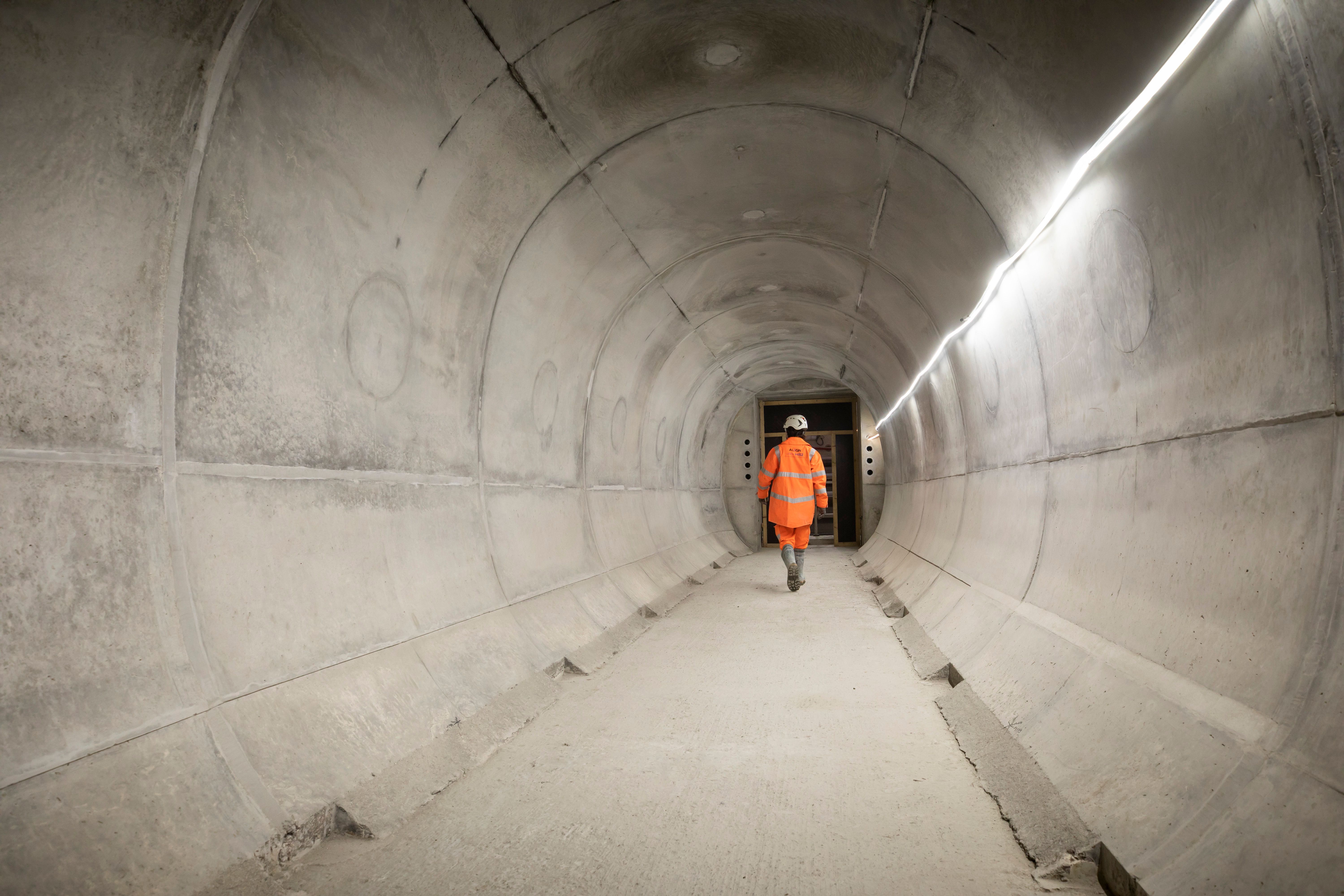 Contractor walking through a Chiltern tunnel crosspassage Nov 2023