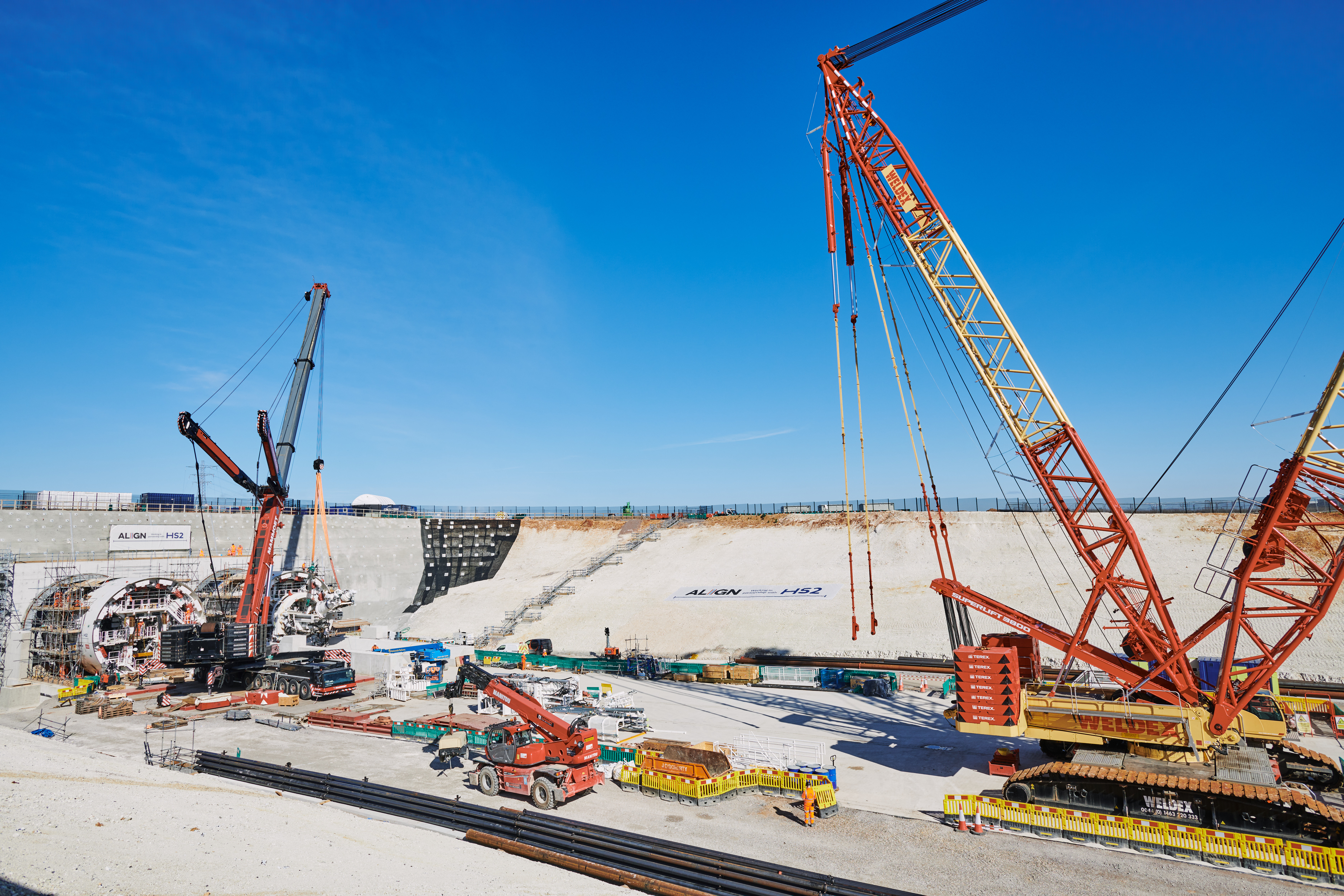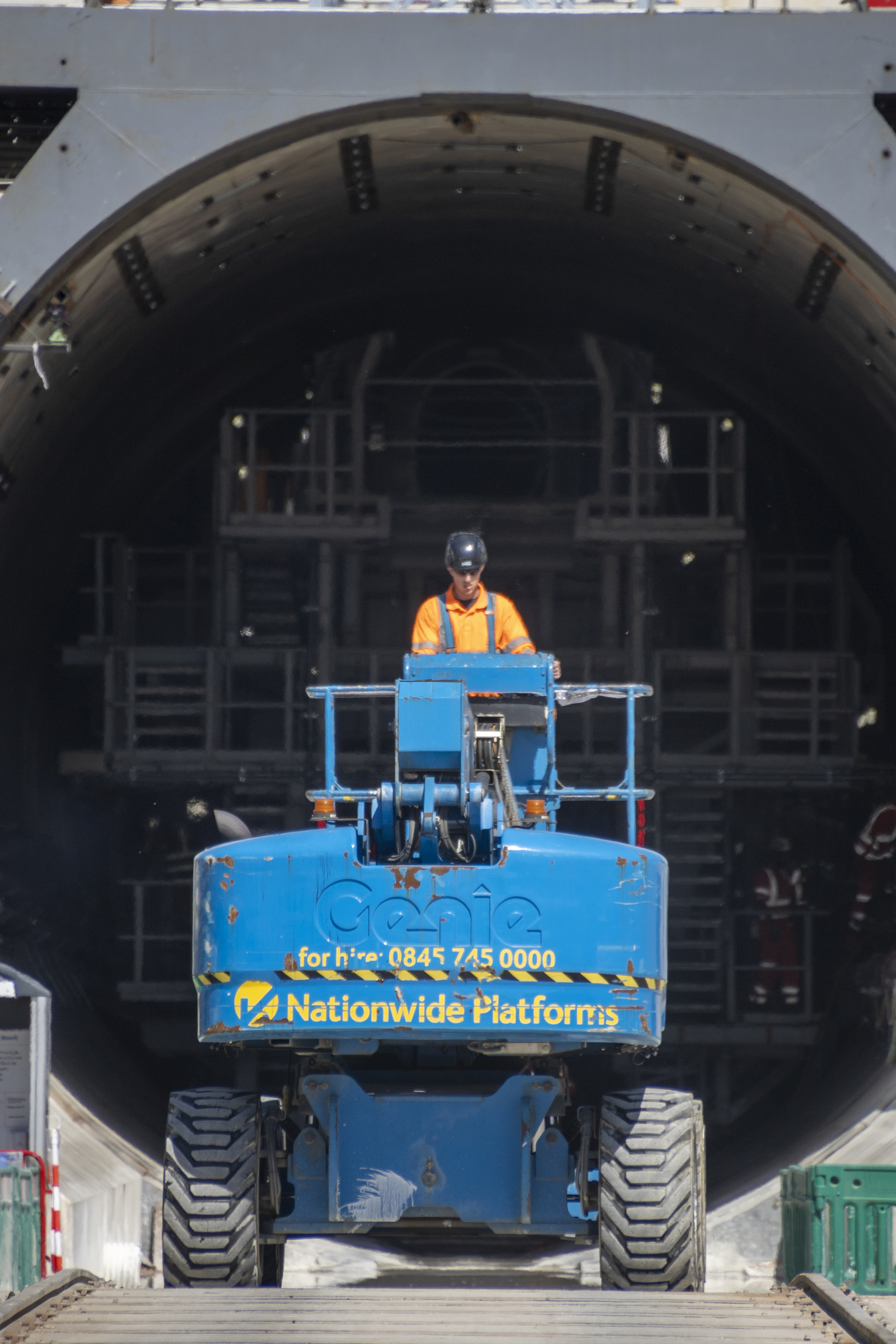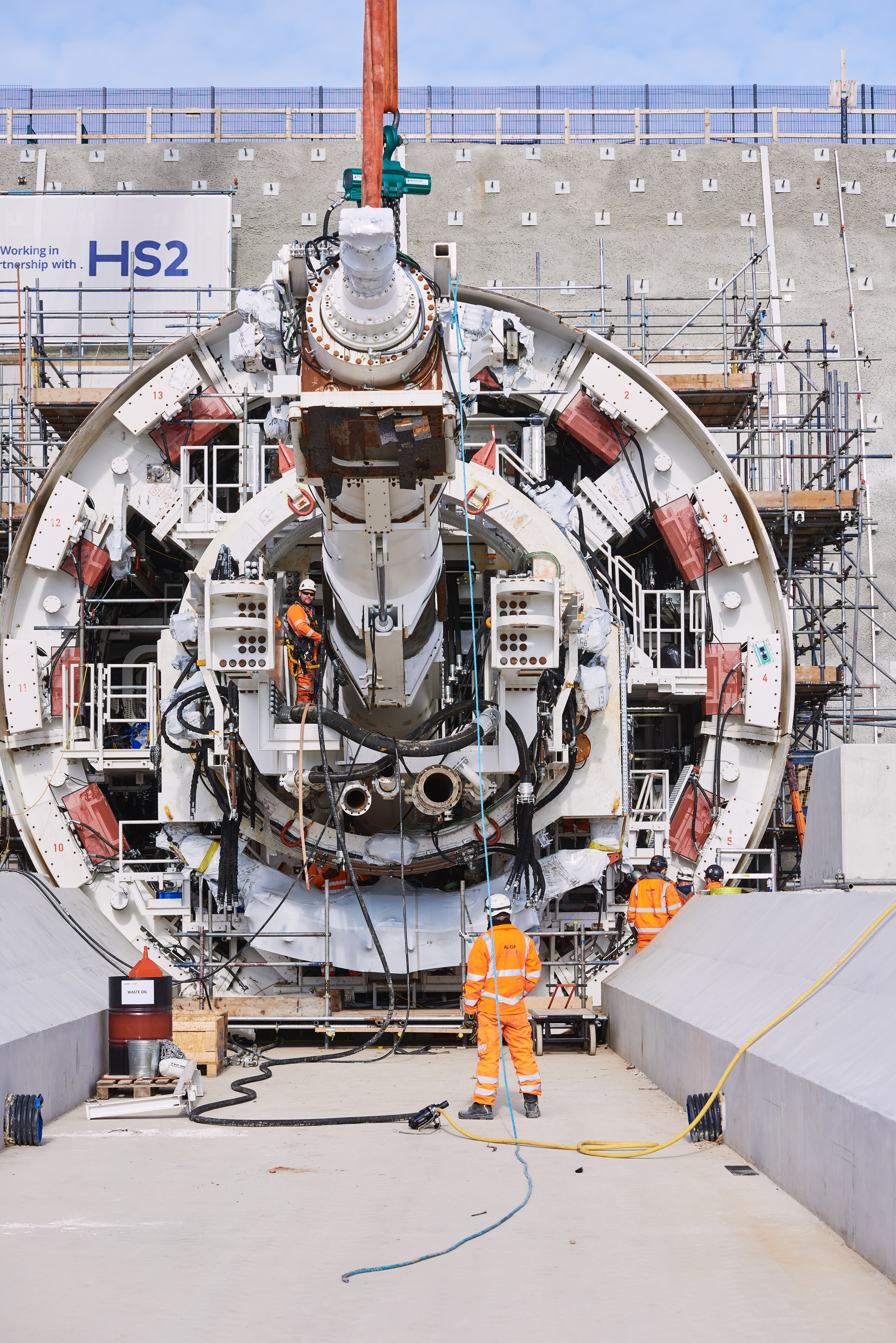 Engineer inspects a pre-cast concrete tunnel segment at HS2's Chiltern Tunnel on site factory in Hertfordshire HS2-VL-21912