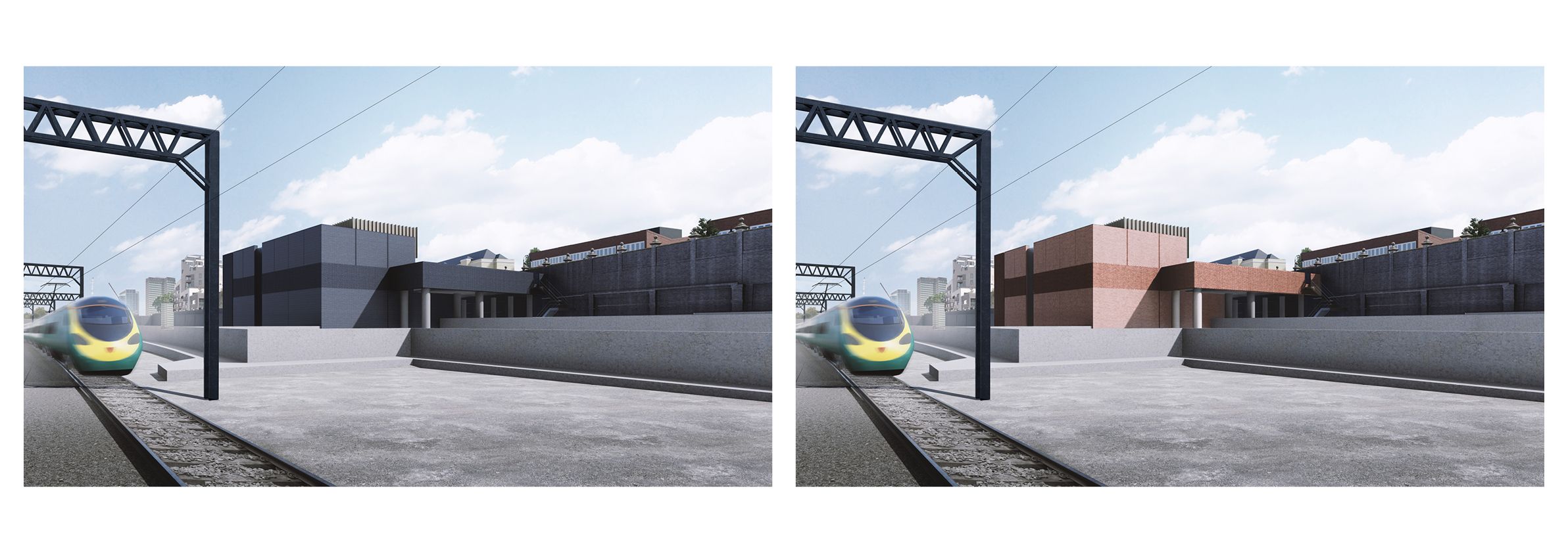 Euston Portal Headhouse design shown from inside headhouse compound in Staffordshire blue brick