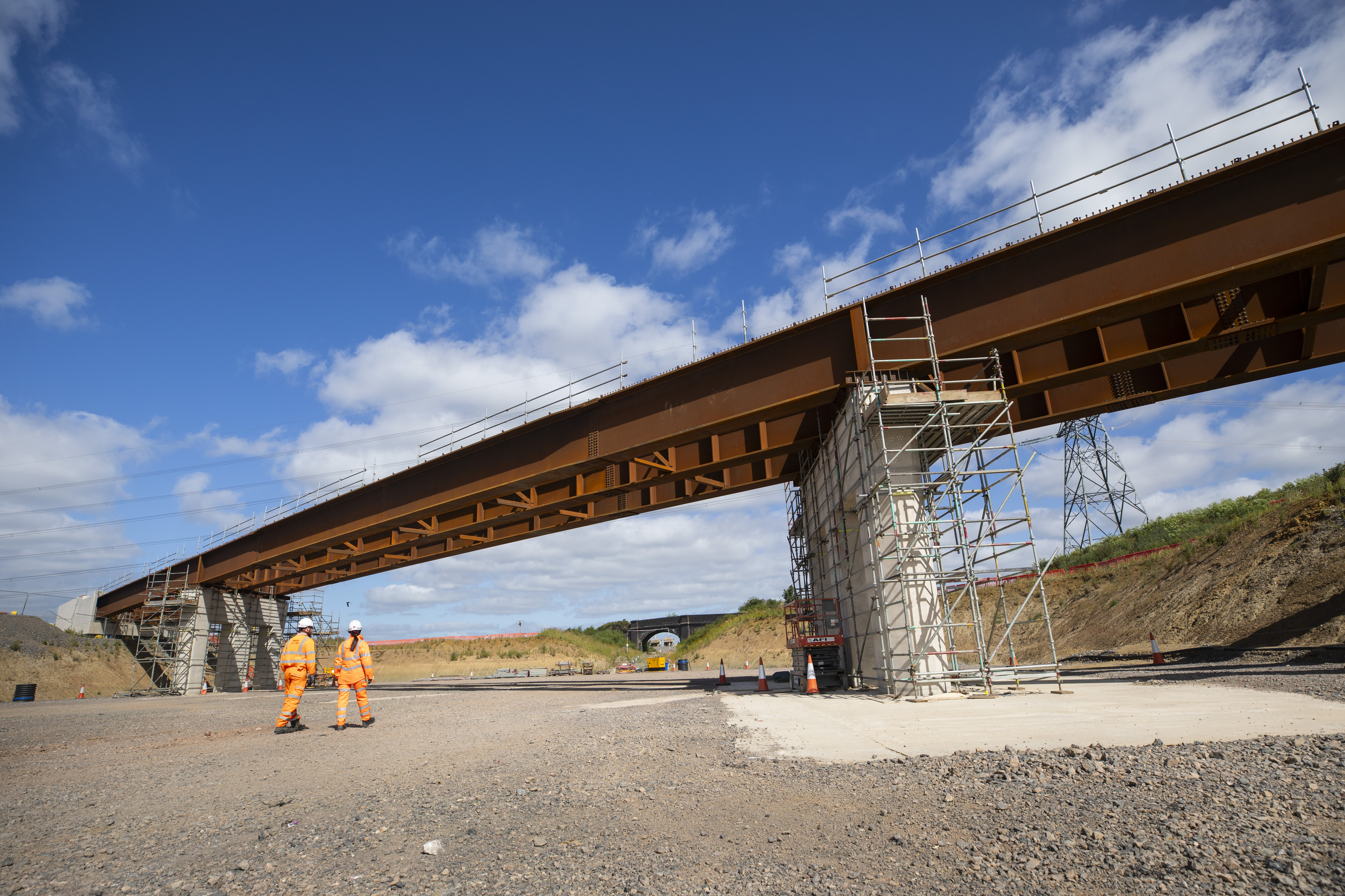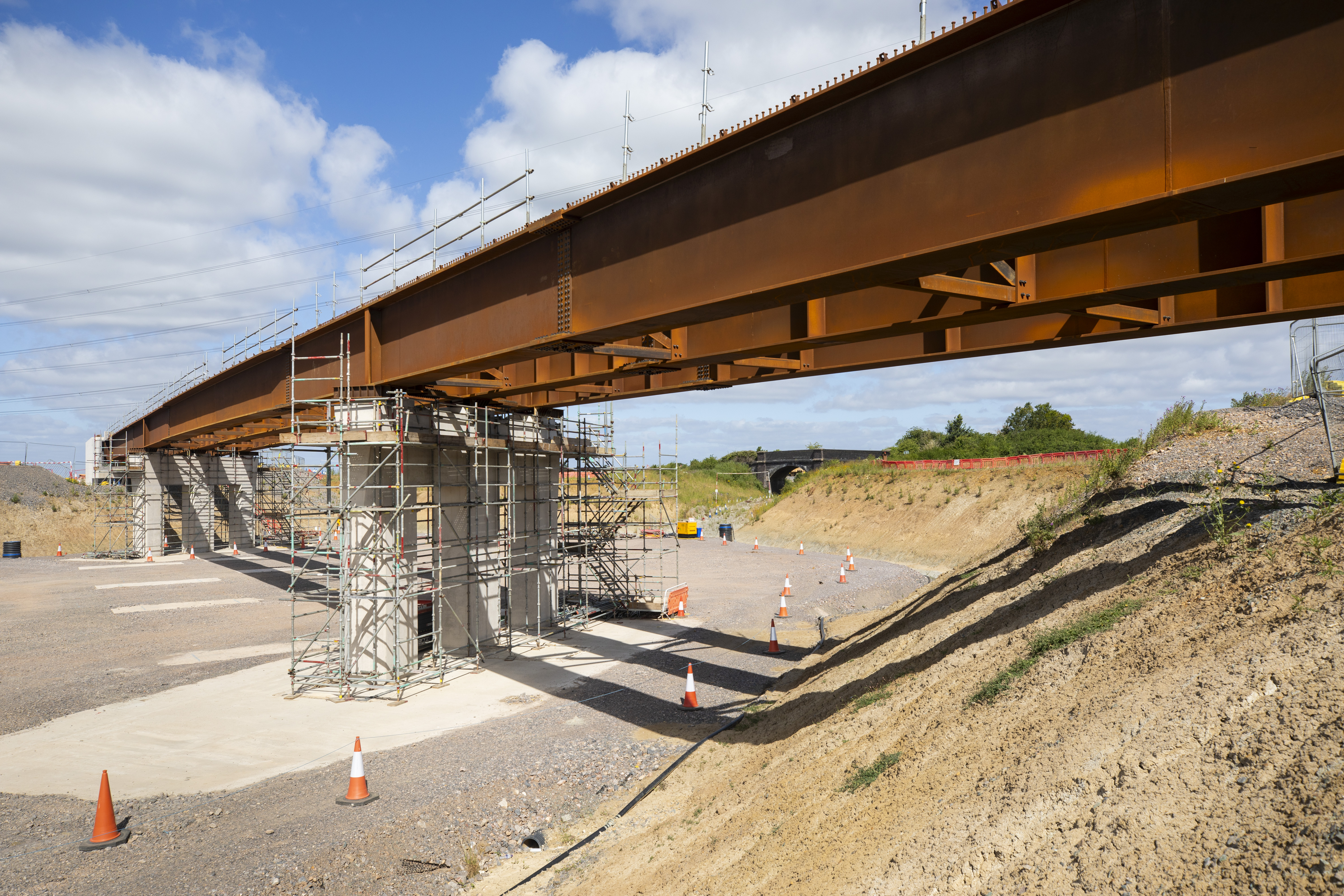 Steel beams in place for the new Edgcott Road overbridge looking south towards the original bridge July 2024