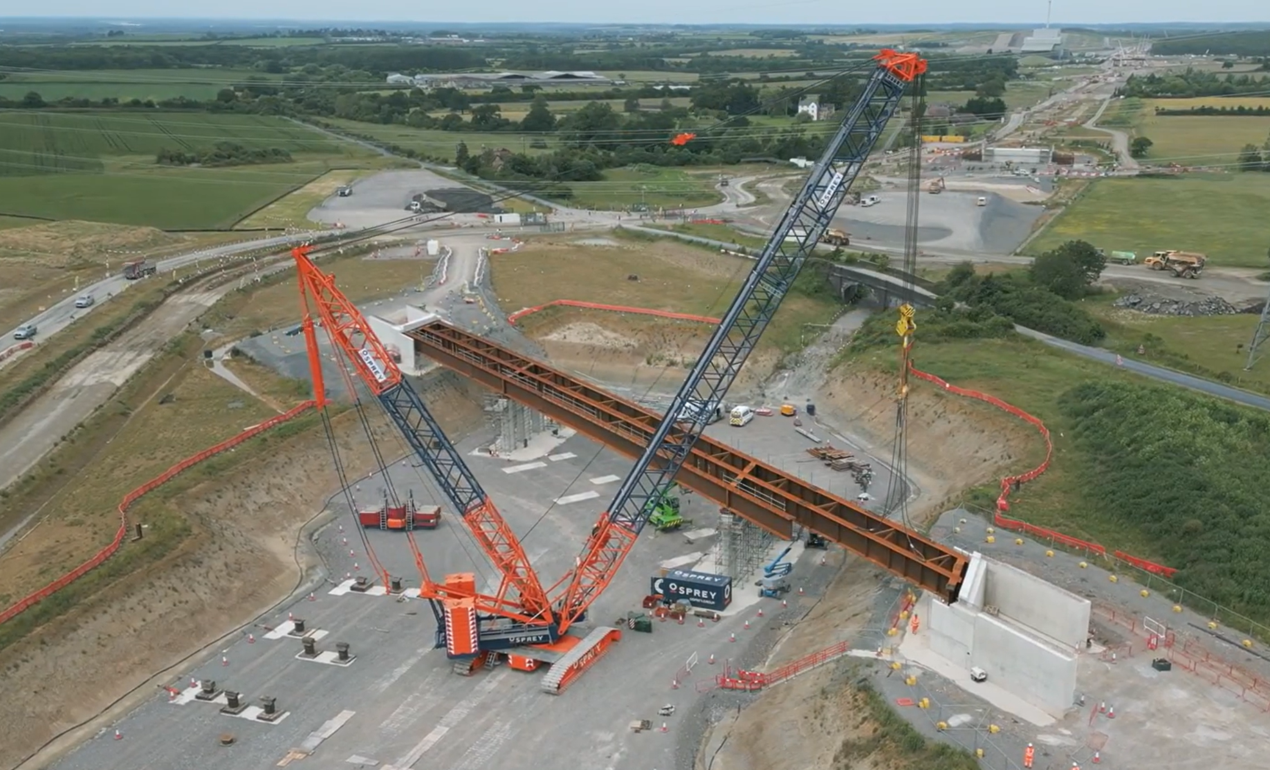 Lifting the main steel sections that form the beams for HS2's Edgcott Road overbridge June 2024