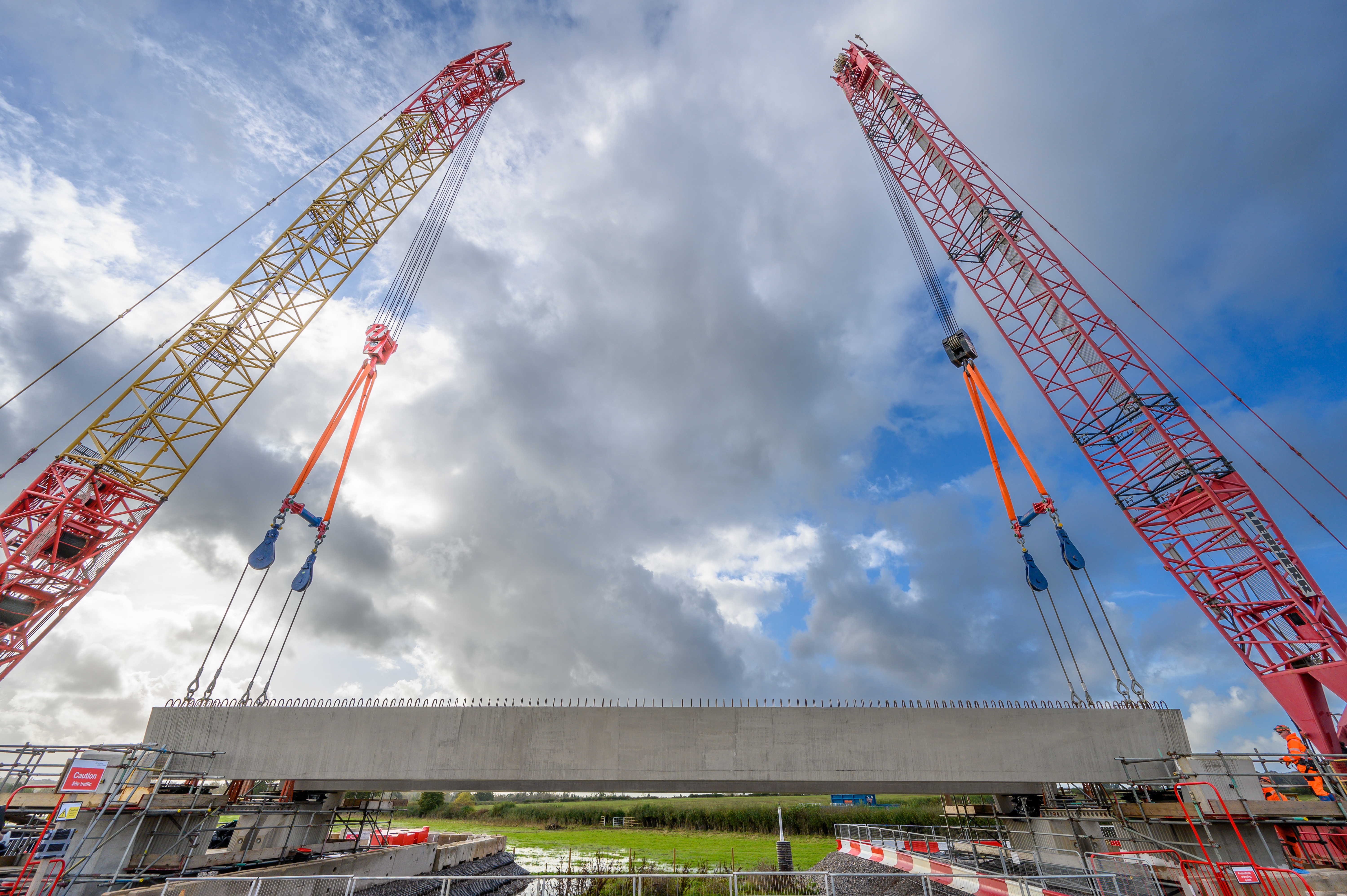 Thame Valey viaduct beam suspended from two crane during construction Oct 2023