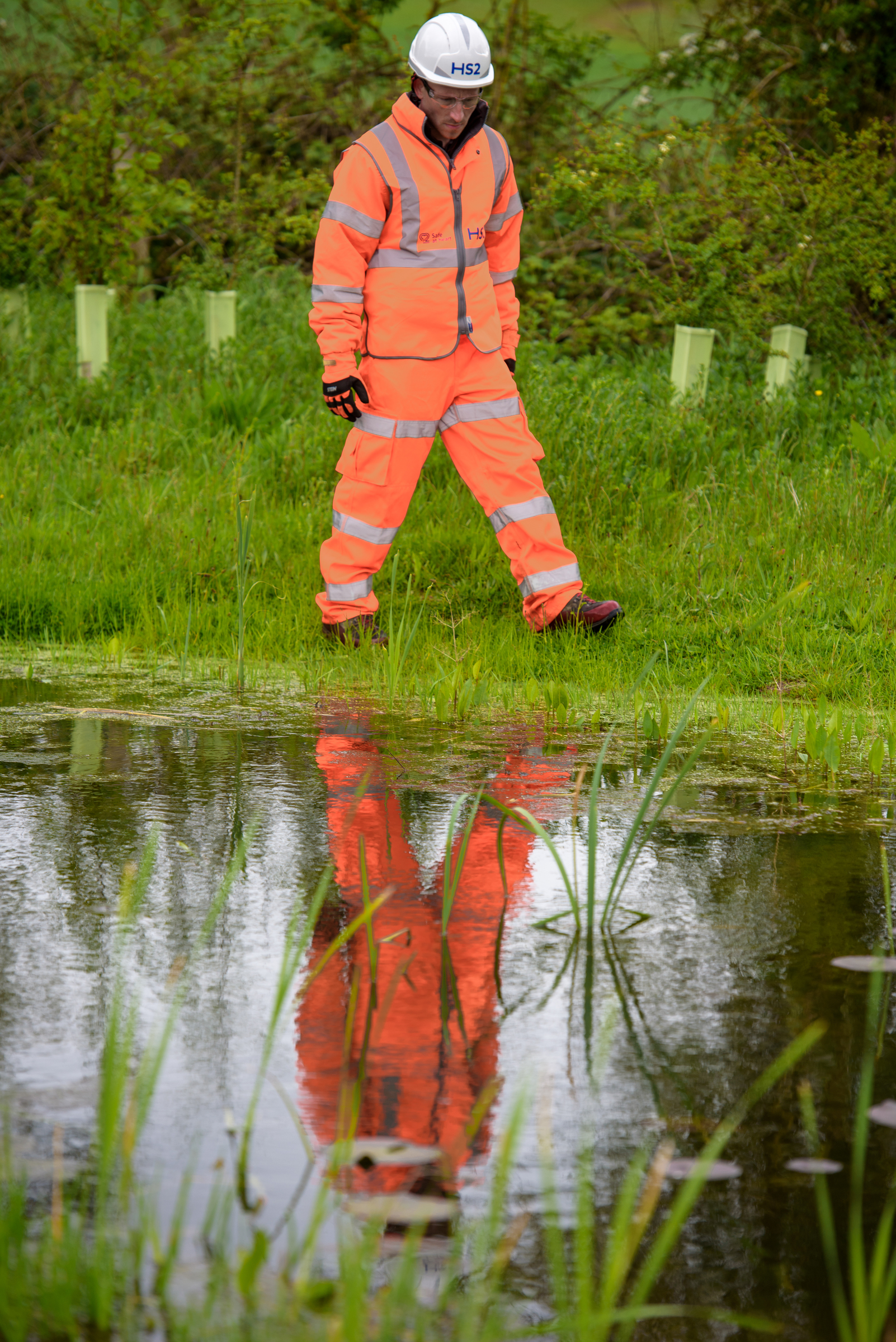 HS2 workers adding material to a bug hotel at the Adelaide Road Nature Reserve, Camden.
