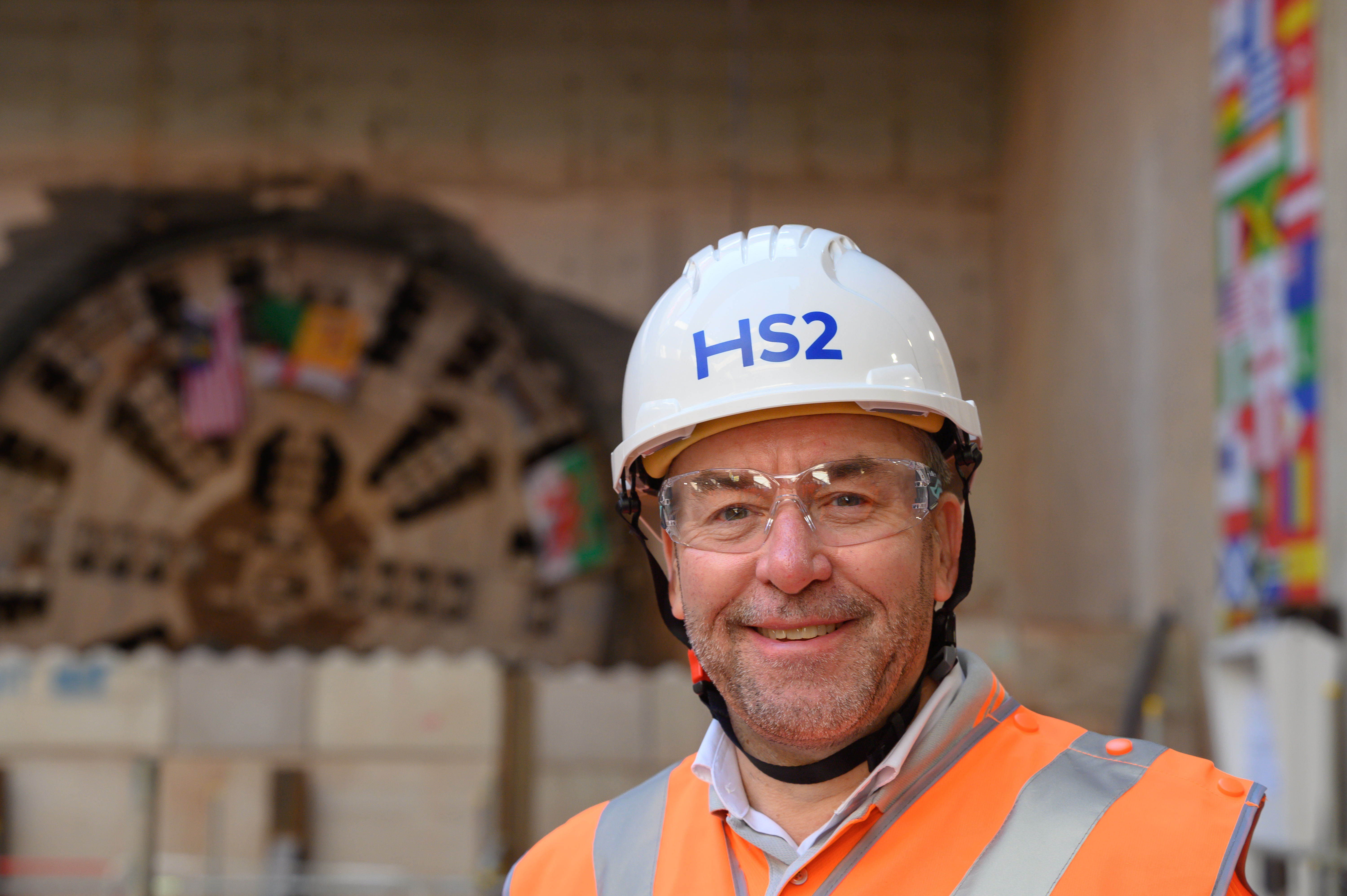 HS2 CEO Mark Wild stands in front of the Tunnel Boring Machine Mary Ann which completed the first tunnel breakthrough in Birmingham