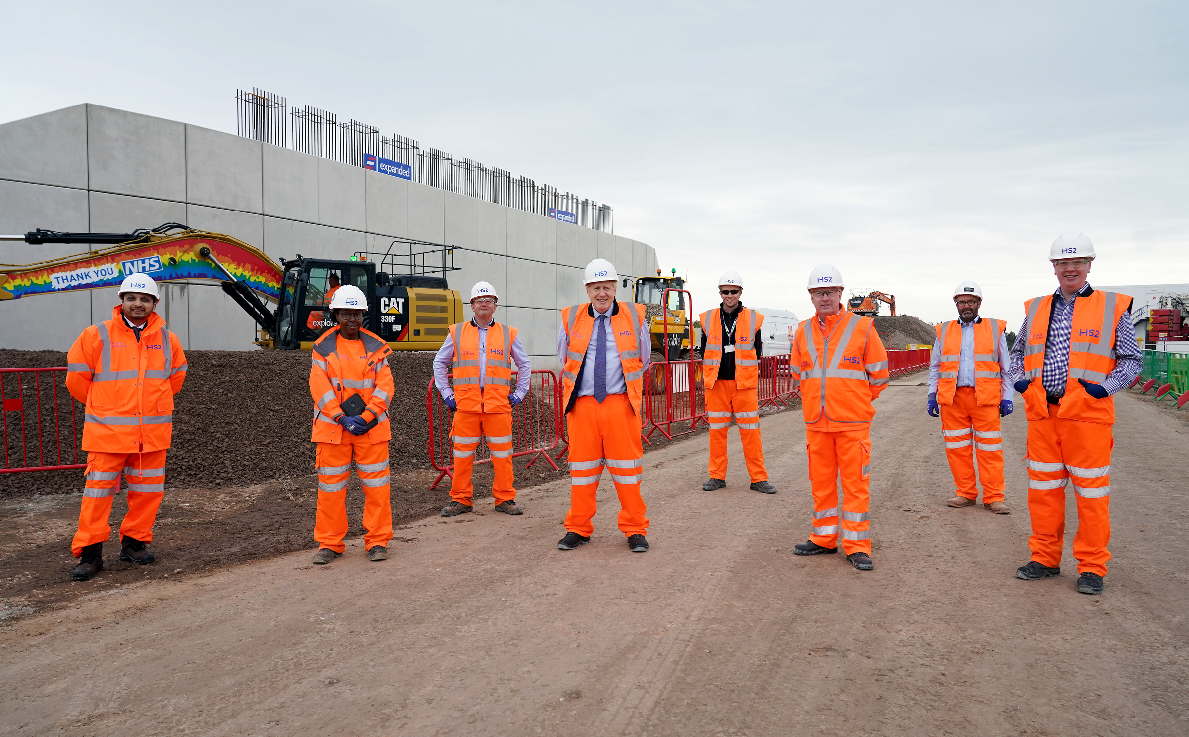 Prime Minister Boris Johnson visits one of the largest HS2 construction sites, the HS2 Interchange Site, Birmingham. HS2 announce the creation of 22,000 jobs. Also pictured Solihull MP Saqib Bhatti