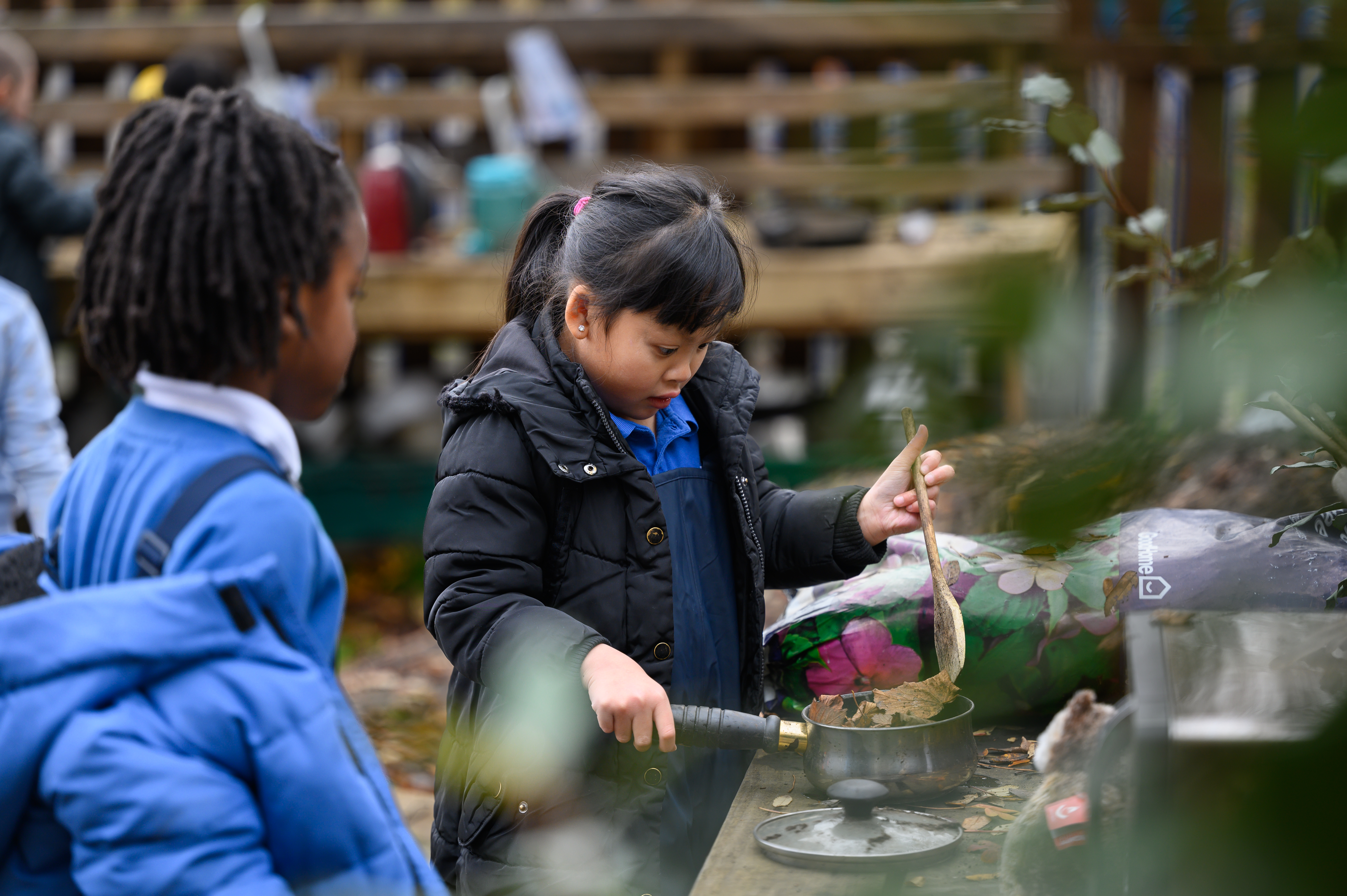 Pupils at Paget Primary School in the mud kitchen in the Forest School