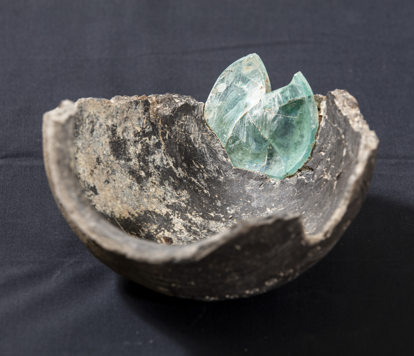 6th Century ceramic window urn with reused Roman glass fired into the bottom uncovered during HS2 archaeological excavations in Wendover