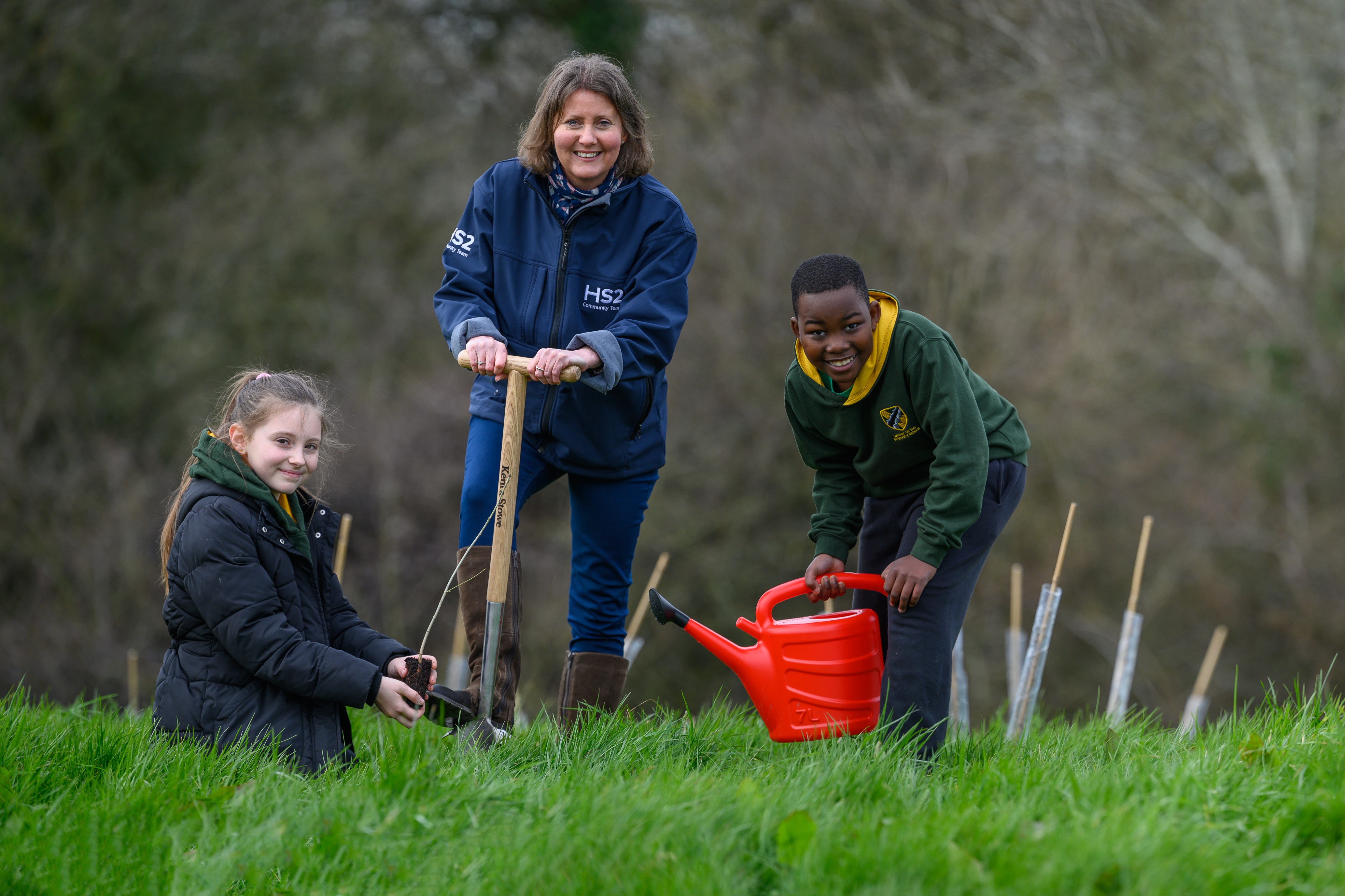 Water Orton Primary School pupils and a representative from HS2 planting donated oak saplings, March 2022