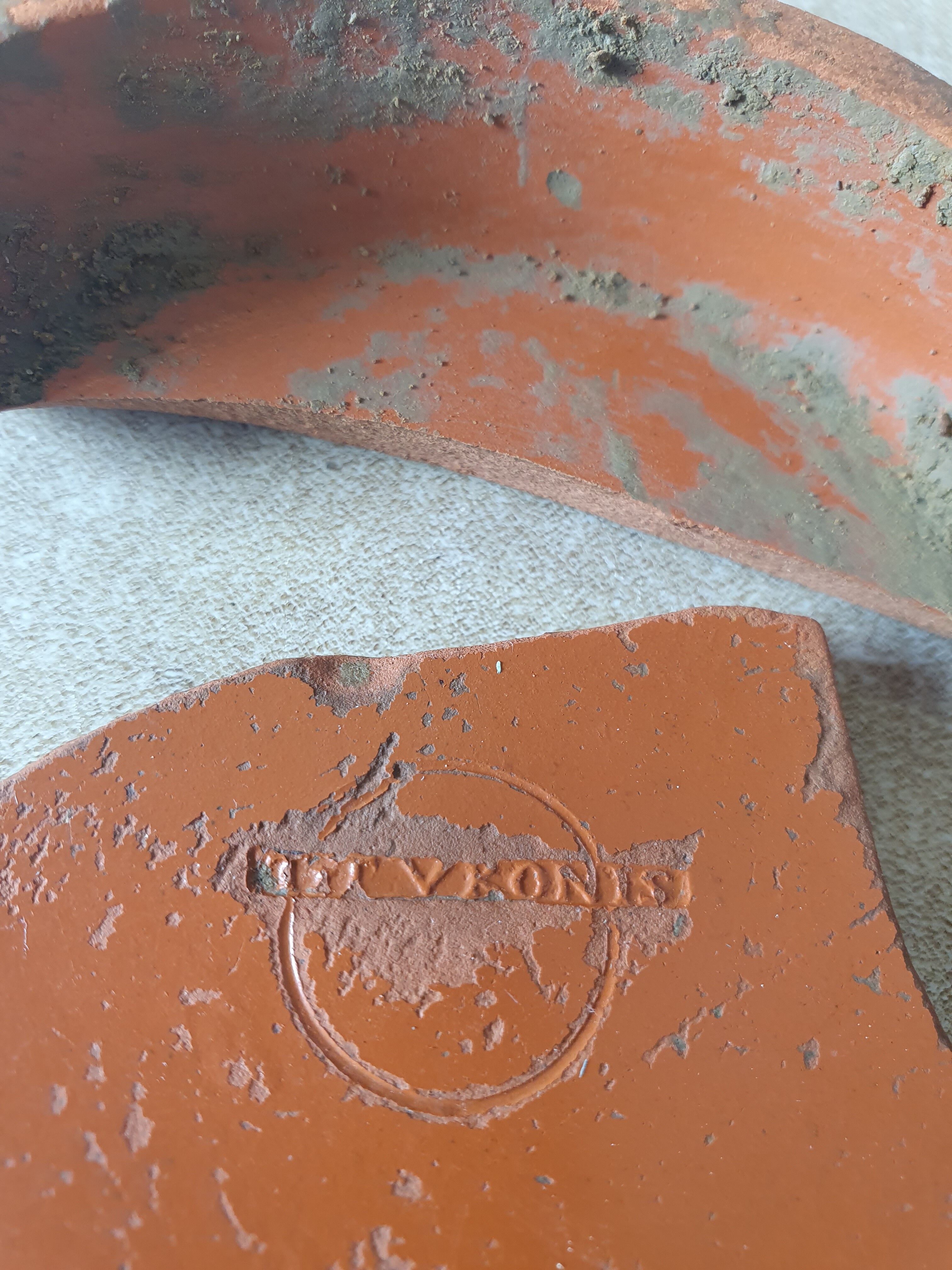 Samian pottery dish, with makers mark, uncovered during archaeological excavations at Fleet Marston, near Aylesbury, Buckinghamshire. Excavations took place during 2021.